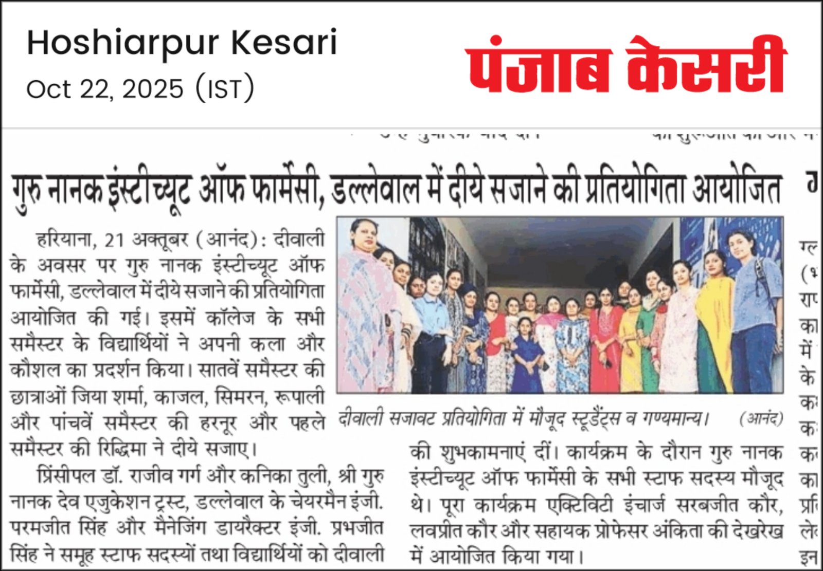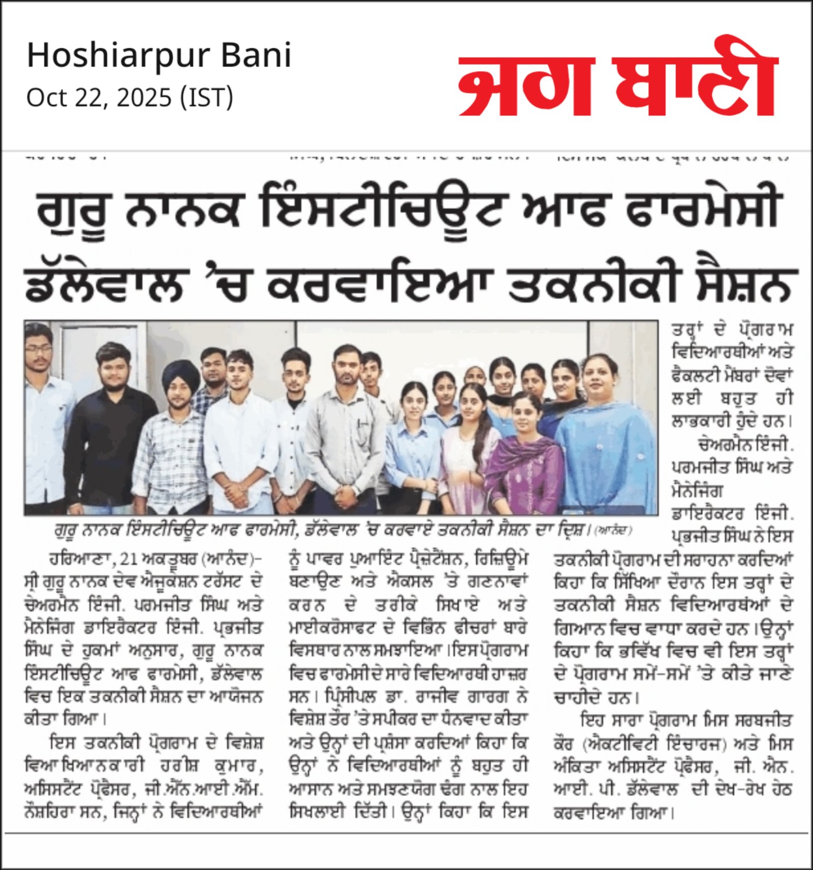 Guru Nanak Institute of Pharmacy, Dalewal, Hoshiarpur is a self financed, multidisciplinary leading pharmacy institute in Punjab, India. The institution was established in the year 2007 with the view of providing quality education and to inoculate a spirit of social relevance among the young technocrats within 5 years of its inception, Guru Nanak Institute of Pharmacy has become one of the premier pharmacy college in Punjab and due to its excellent academic delivery with the state of manufacturing techniques, ultra modern labs with effective placements in the Punjab, state..